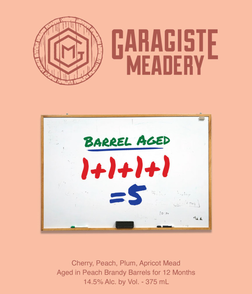 The geniuses at Garagiste started with their Mazer Cup medal-winning 1+1+1+1=5 — a delicious Melomel loaded with red plums, apricots, yellow peaches, dark sweet cherries, and tart cherries. Then they let it rest in a peach brandy barrel for a whole year!