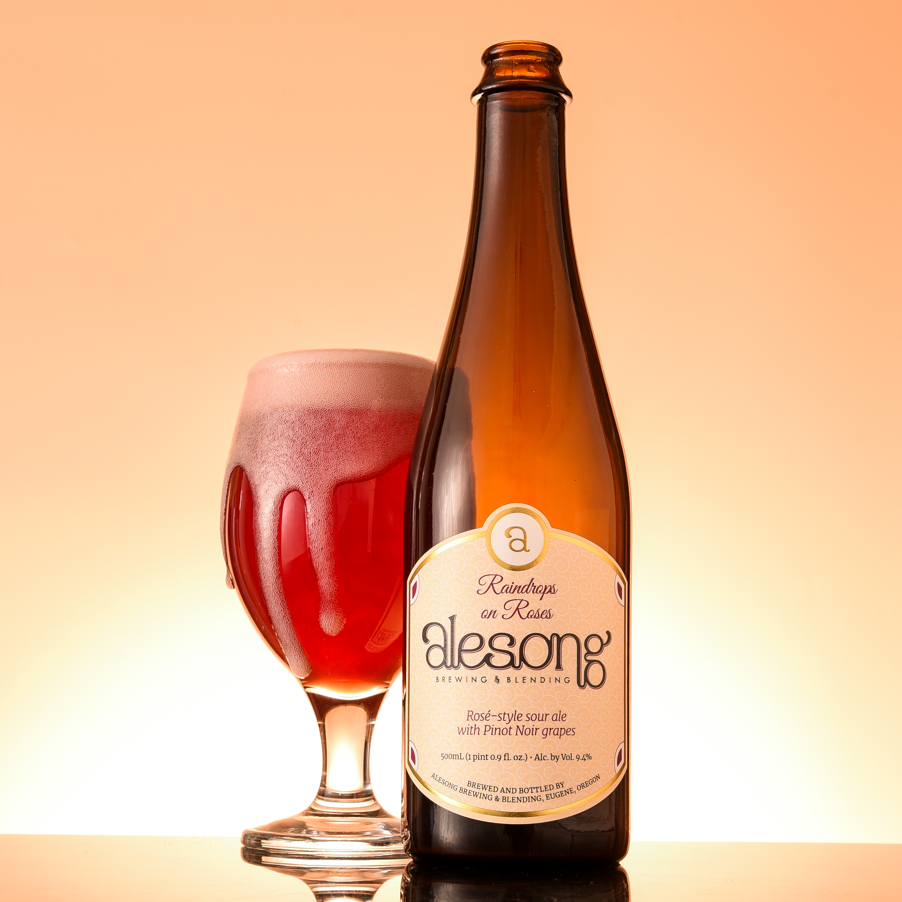 Alesong conditioned the Sour base of Raindrops on Roses with crushed Pinot Noir grapes from their neighbors at King Estate Winery. Then they gave it a short stint in stainless steel before transferring the brew to French oak barrels from Durant Vineyards to finish aging.