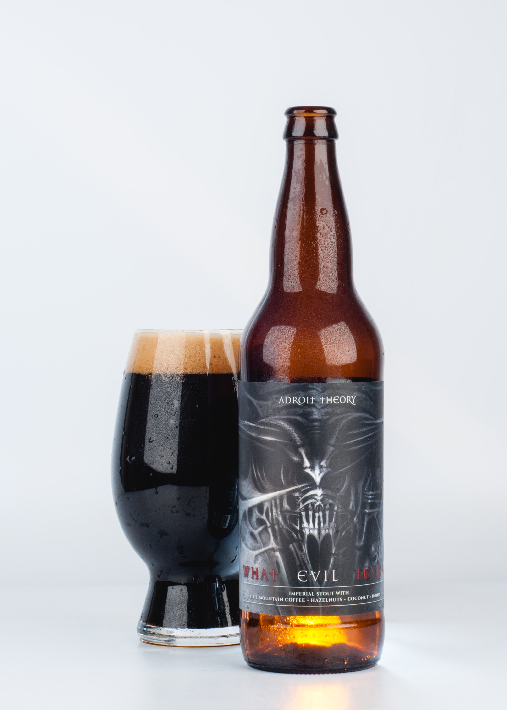 It all makes sense when we see insane flavor combos like today’s 13.5% ABV What Evil Lurks (Ghost 740) Hazelnut + Coconut + Bourbon Honey + Coffee Edition Imperial Pastry Stout.